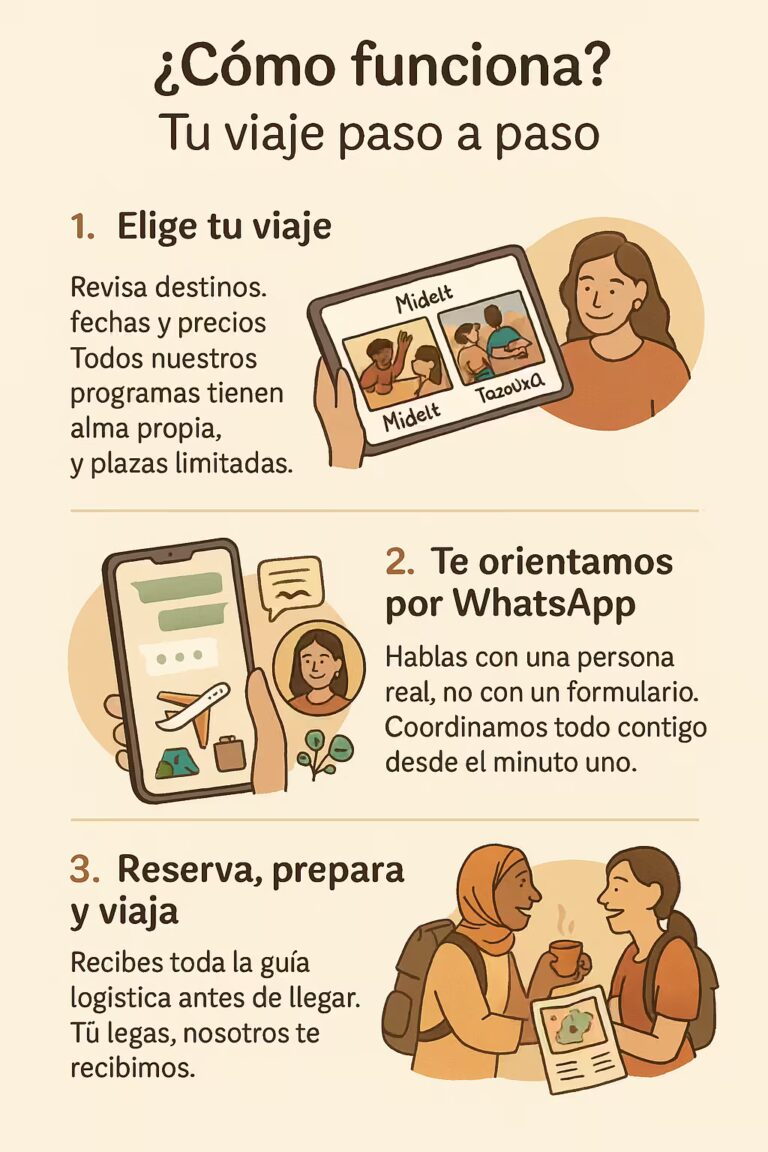 Marruecos no es un destino. Es un cruce de caminos donde la hospitalidad se convierte en aprendizaje, y la solidaridad en vínculo real. Aquí no hay filtros. Solo personas, historias y momentos que no caben en una foto.